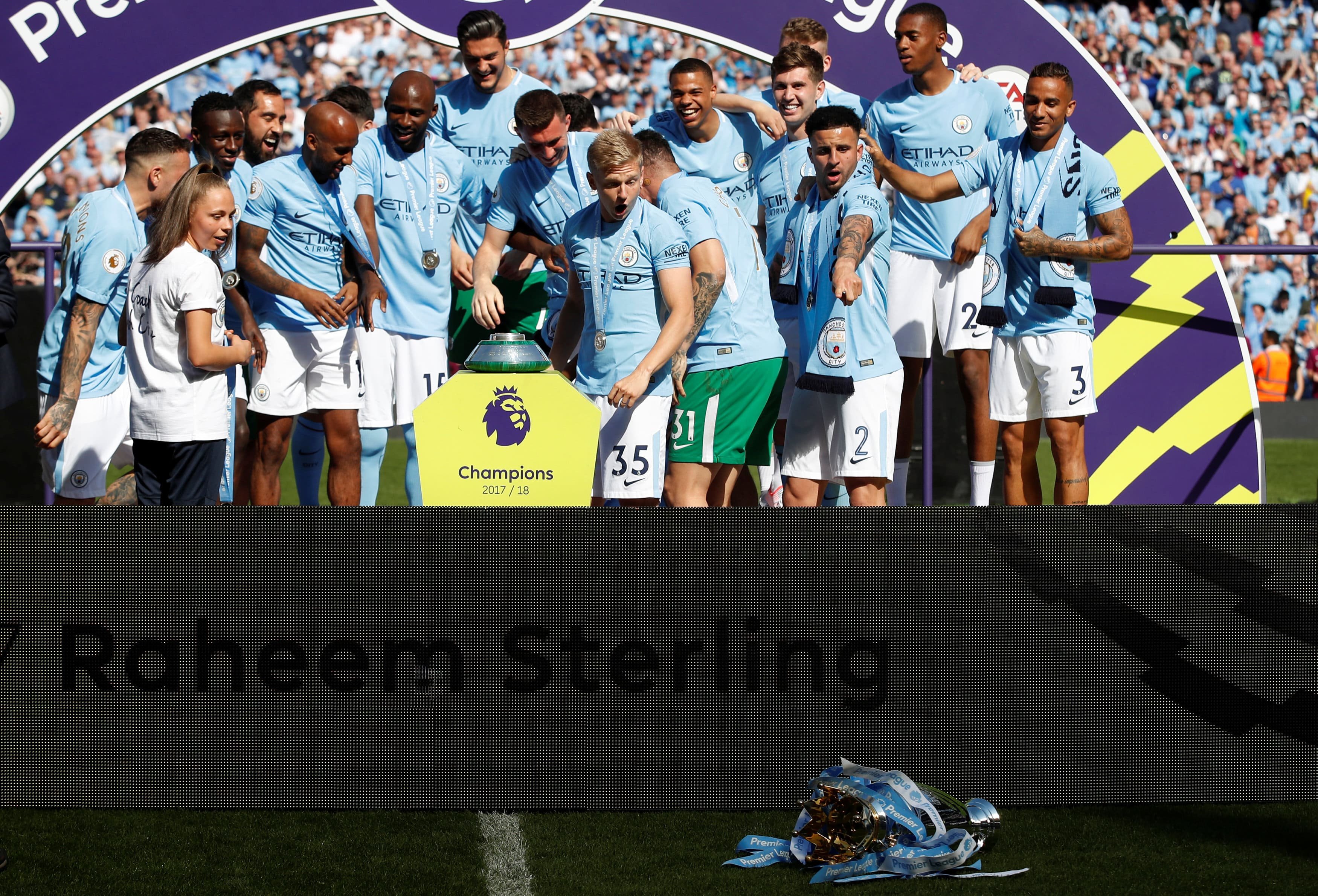 6 мая команде вручили медали и кубок. Церемония награждения состоялась после матча 37-го тура «Манчестер Сити» – «Хаддерсфилд» (0:0). Во время безудержного веселья один из футболистов «Сити» прыгал вместе с партнерами и коснулся трофея спиной. Чаша упала с постамента, а фотографии с эмоциями виновника инцидента разошлись по всему интернету.